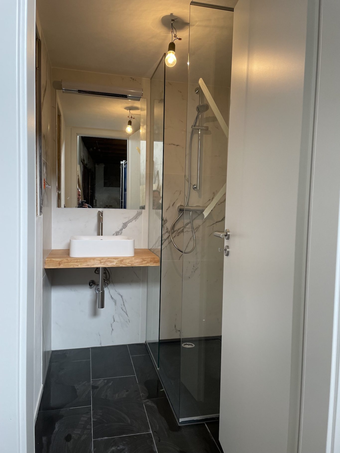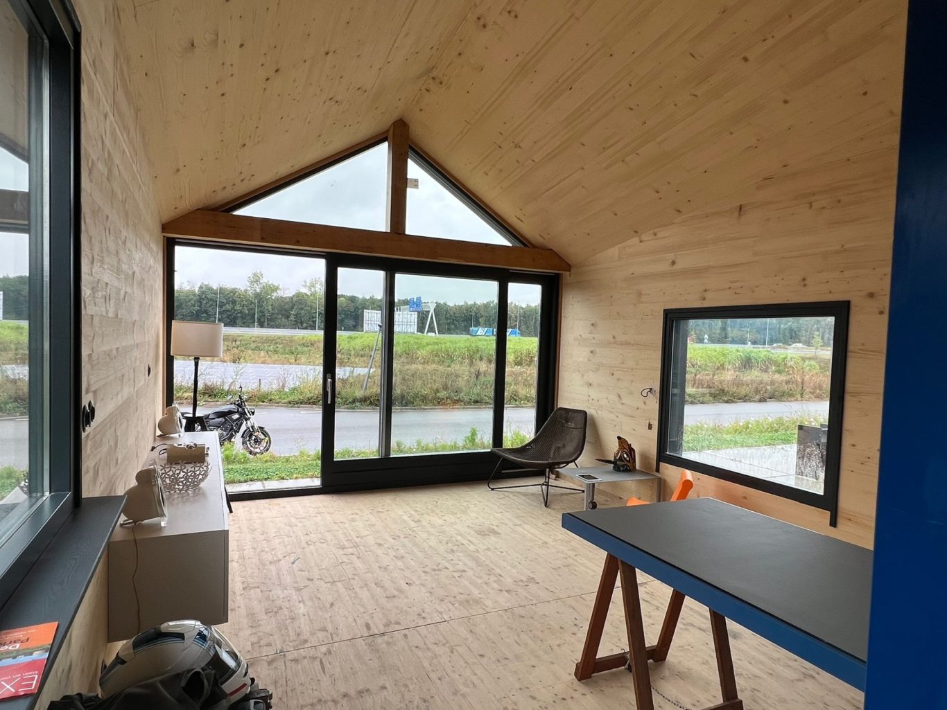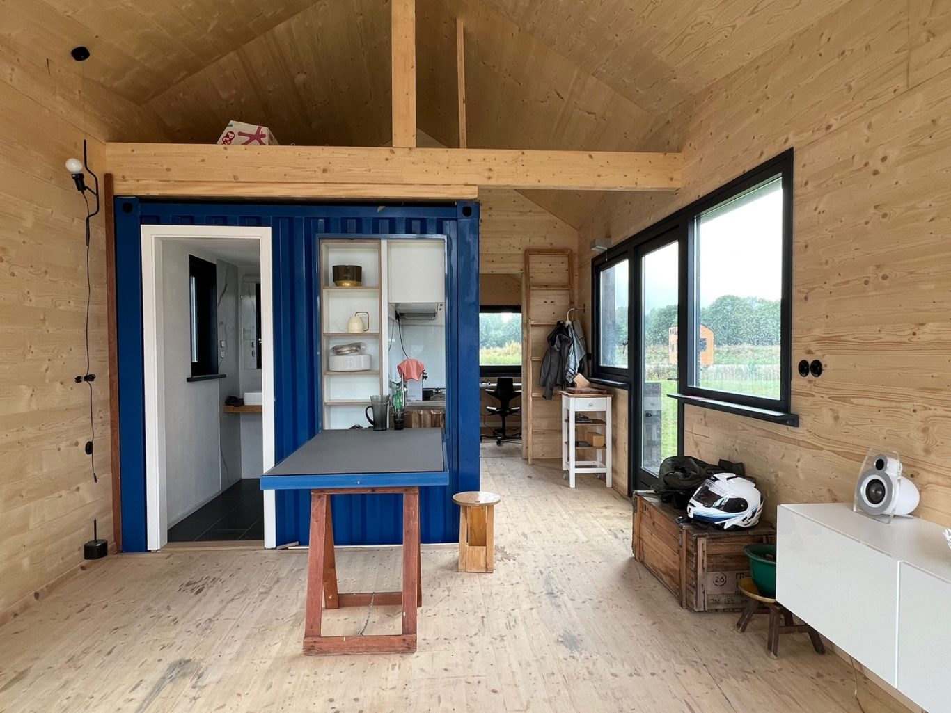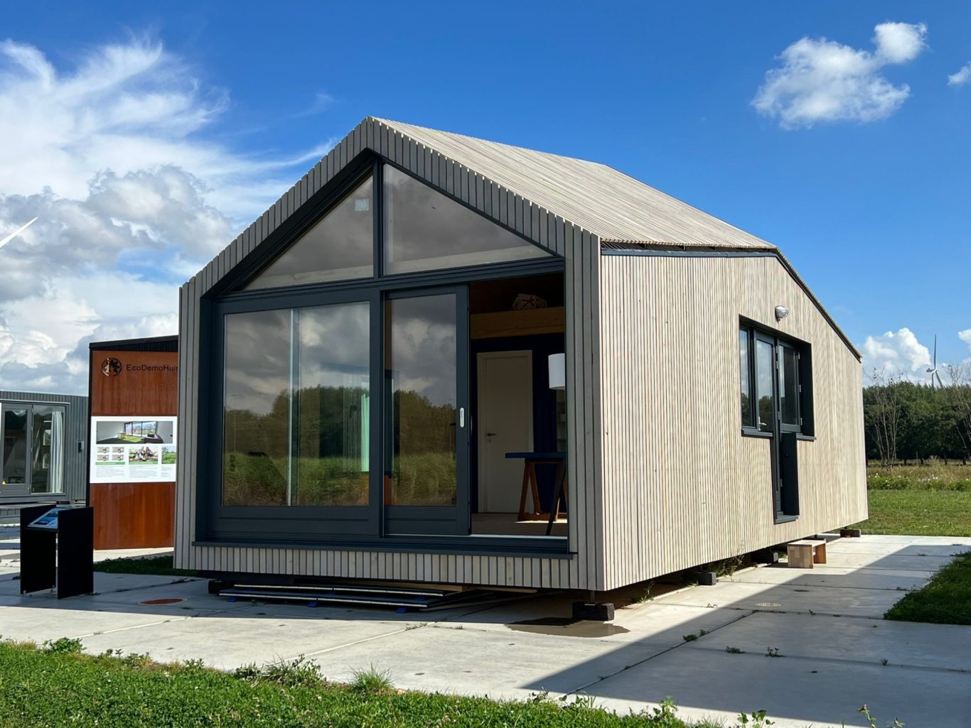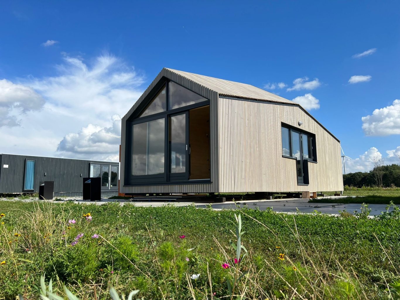 Planung und Bau, so dass das Haus innerhalb von drei Tagen bezugsbereit ist. Hierzu wurde das Badezimmerküchenmodul in der Produktion vorgefertigt, so dass vor Ort nur noch die Anschlüsse verbunden werden mussten. Die Gebäudehülle in 100mm Brettsperrholzelementen, mit Holzfaserdämmung beplankt, wurden auf die max. Transportmaße für einen Standard LKW geplant und vorgefertigt. Durch eine detaillierte Planung und enge Abstimmung mit dem Architekten und Bauherrn, wurden Materialien und Elemente passgenau aus unterschiedlichen Produktionen vor Ort, in der vorgegebenen Zeit und Budget, zusammengefügt. Das Haus, welches im Demopark in Almere steht, kann probebewohnt werden, so dass Interessenten das Gefühl „Tinyhouse“ erfahren können.